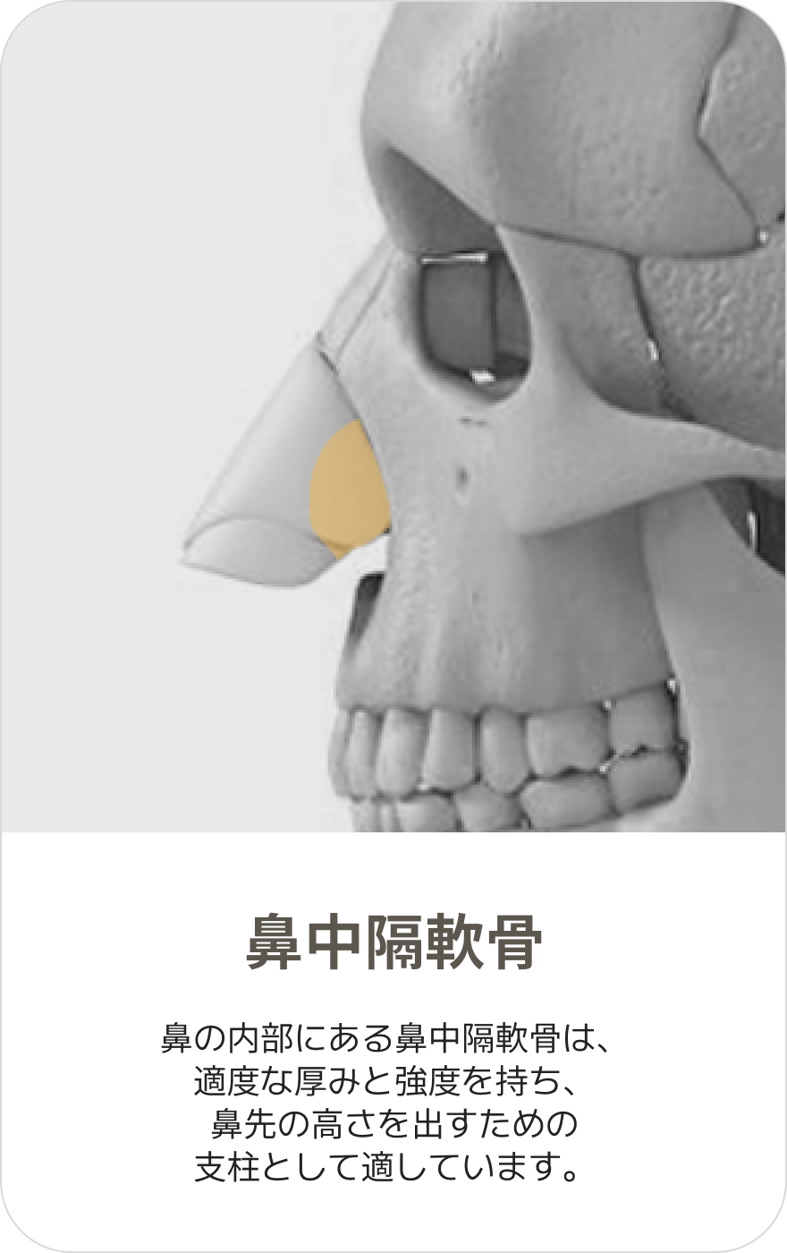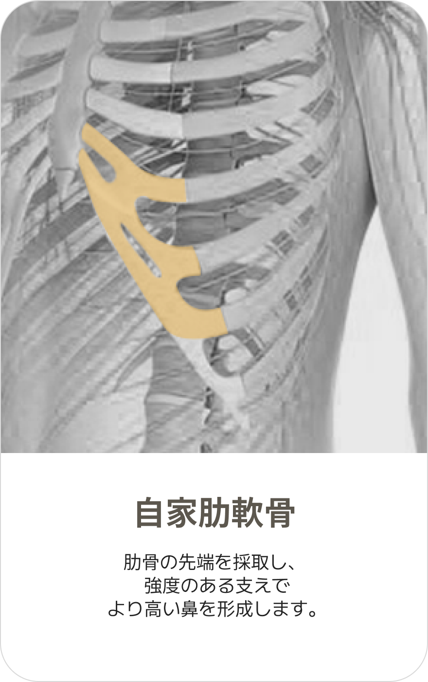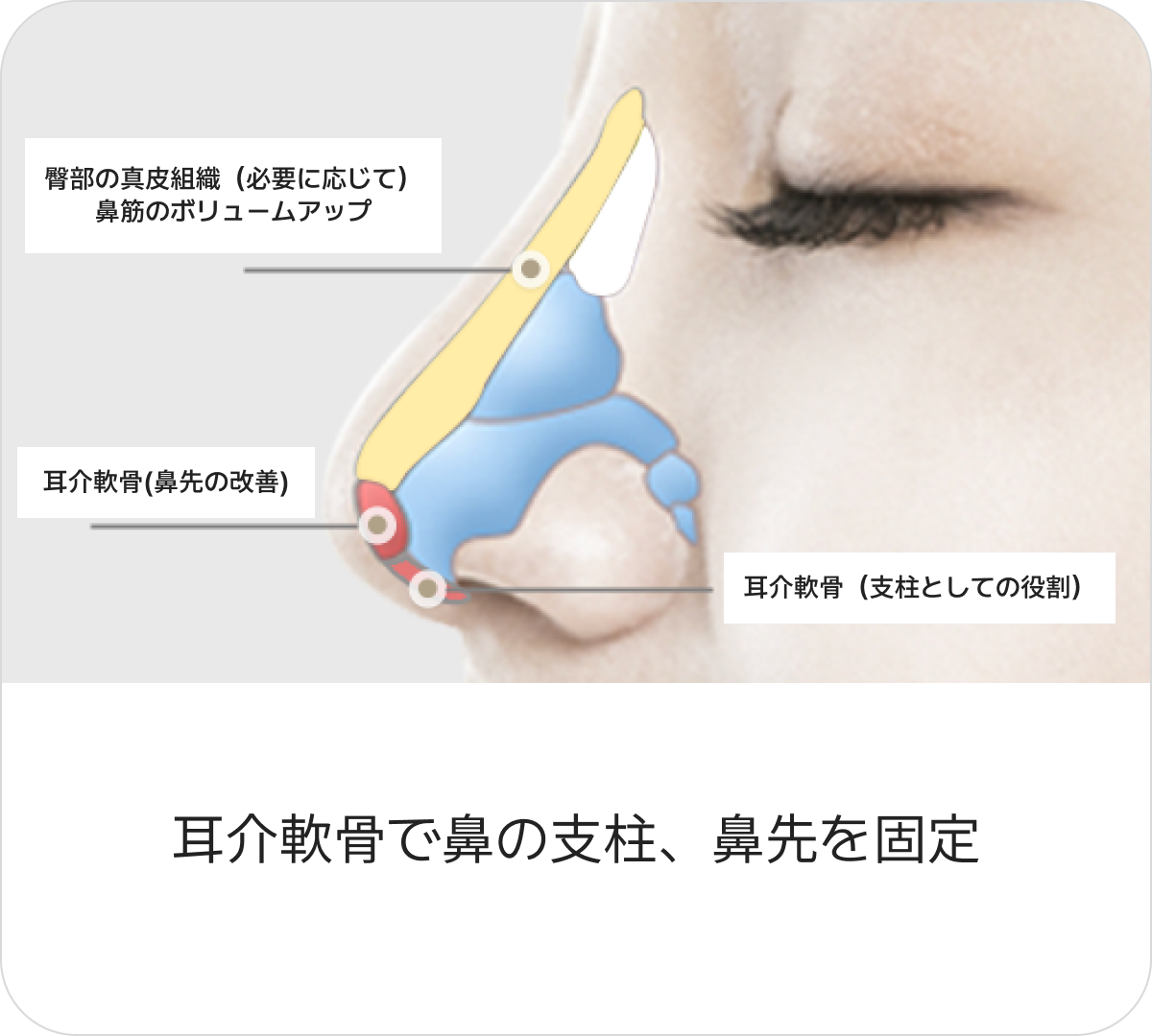耳介軟骨と鼻中隔軟骨の長所を活かした手術で、鼻中隔延長術により鼻先をしっかりと高くし、